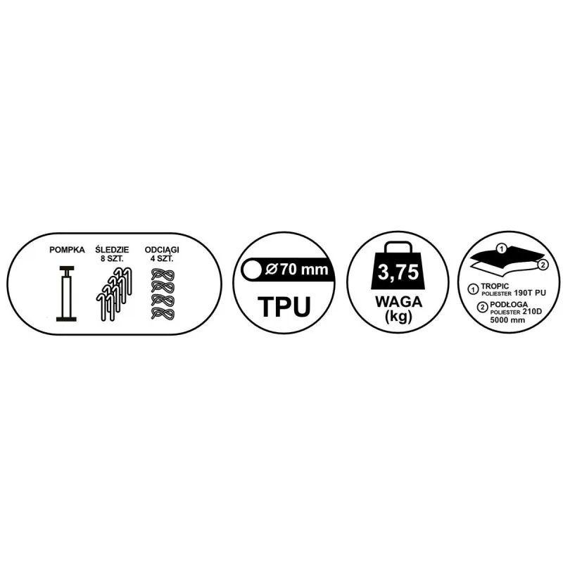 - Material: 190T/PU1000mm Ripstop polyester tent, floor – 210D 5000mm polyester, canopy – 210D 1500mm polyester, inflatable tubes with a diameter of 70mm TPU