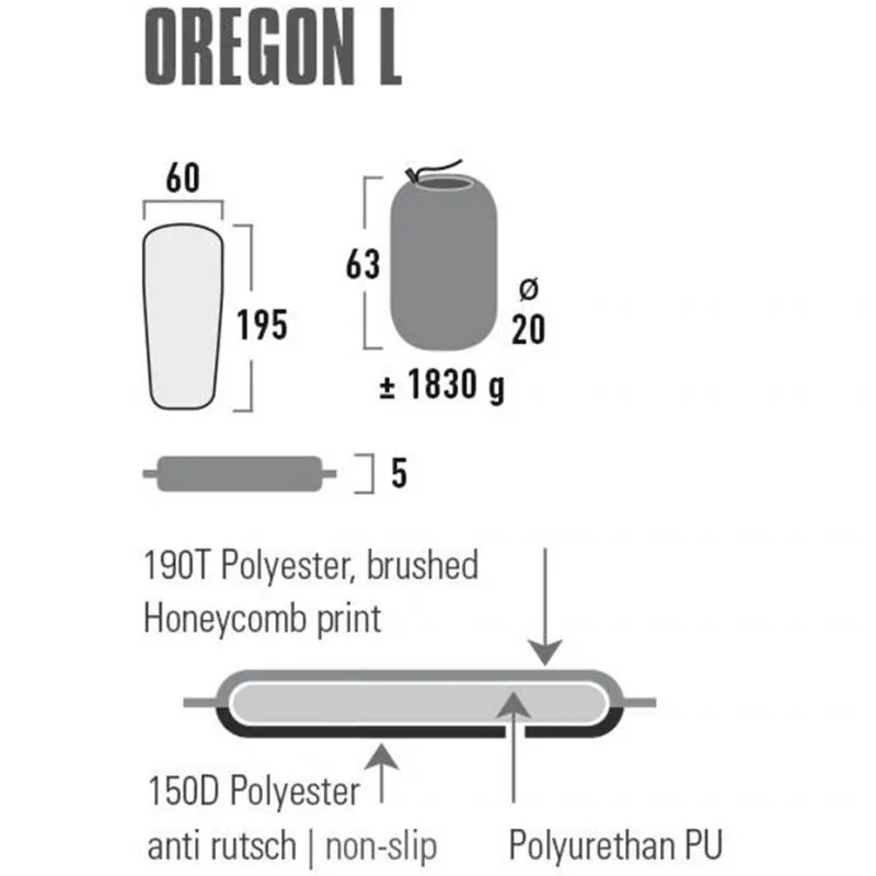 Το αυτοφουσκωτό στρώμα είναι κατασκευασμένο από υψηλής ποιότητας, αντιολισθητικό ύφασμα από βουρτσισμένο πολυεστέρα. Η κάτω πλευρά είναι κατασκευασμένη από ανθεκτικό αντιολισθητικό πολυεστέρα. Το αυτοφουσκούμενο στρώμα Oregon είναι εξοπλισμένο με βαλβίδα ελέγχου. Το στρώμα συνοδεύεται από 2 ιμάντες συμπίεσης και μια τσάντα.