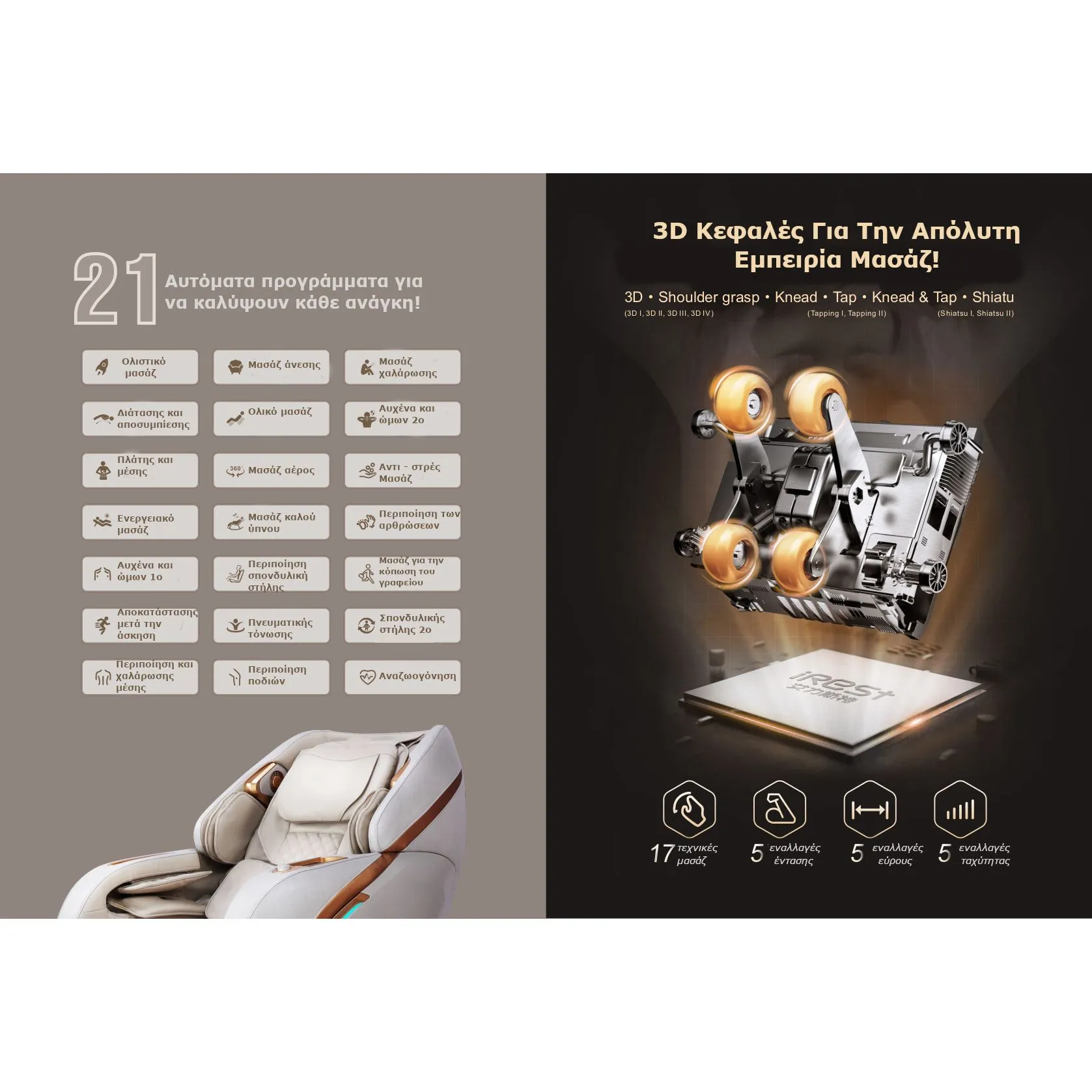 – 17 διαφορετικές τεχνικές μασάζ – περισσότερες από κάθε άλλη πολυθρόνα – με 4 εκ των οποίων να ανήκουν στην λειτουργία 3D.